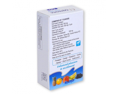 Efectos: El fármaco es un gel potencial que se encuentra en una bolsita. Diferentes sabores cubren el sabor amargo del ingrediente activo, el que proporciona una fuerte erección, que dura aproximadamente de 4 a 6 horas. La línea de productos de Kamagra contiene el ingrediente activo original de la Viagra, por eso, la eficacia no se diferencia del original. Debido a la regulación de la enzima PDE-5 que disminuye la erección, permite una solución a la disfunción erectil de forma fiable.